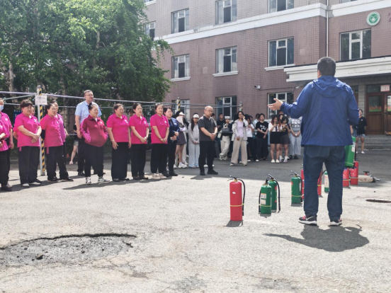 消防疏散逃生演练结束后,保卫处防火科工作人员向现场学生及公寓工作人员详细讲解了常用灭火器的原理、分类及适用范围,指导现场学生、公寓工作人员掌握灭火器操作要领及消防水带连接方法。