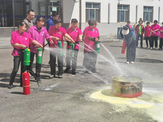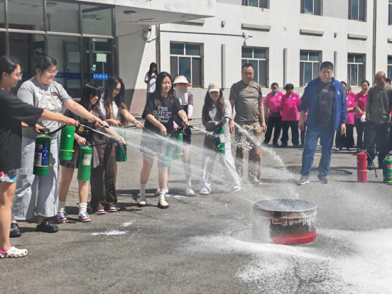 工作人员现场设置了模拟火源,并分别使用干粉灭火器及水基灭火器进行了灭火操作示范。在工作人员指导下,学生及公寓工作人员进行了使用灭火器及连接消防水带的实际操作。